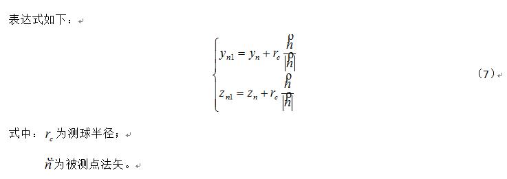 基於齒輪測量中心,求解圓弧圓柱蝸杆軸截麵齒(chǐ)廓坐標   ,控製(zhì)儀器Y軸和Z軸聯動實現蝸(wō)杆軸截麵(miàn)齒廓掃描測量,測頭(tóu)的微變化量反映(yìng)齒(chǐ)麵加工誤差,如圖4所示。鑒(jiàn)於圓環麵包絡圓柱蝸杆(ZC1)、圓環麵(miàn)圓柱蝸杆(ZC2)軸截麵齒廓方程(chéng)均為超(chāo)越方(fāng)程,其處理方式為根據變(biàn)參數   離散得到一組足夠多的等間隔軸截麵齒廓坐標點   ,軸向圓弧圓柱蝸杆(ZC3)可通過軸(zhóu)截(jié)麵齒廓方程直接(jiē)獲取一組等(děng)間隔軸截麵齒廓坐標點   。如果使(shǐ)用球形測頭(tóu)對這三種蝸杆的軸截麵齒廓(kuò)進行測量,通過齒輪測量中心讀出的數據為(wéi)測球中心的位置坐標,而不是測球球形表麵和工件實際接觸點(diǎn)的位置坐標,這樣獲(huò)取的坐標值(zhí)與理論接(jiē)觸(chù)點坐標計算比較,得到的結果會有一定的誤差。為了便於測量和得到正確的測量結果,應對(duì)被測點進行測球半徑補(bǔ)償。因此需要將求解的蝸杆軸截麵齒廓坐(zuò)標點(diǎn)   轉(zhuǎn)換到與之對應的測球軌跡坐標點,這樣(yàng)才能保證測球與工件接觸點與理論齒廓(kuò)坐(zuò)標點一致,避開了測球半徑導(dǎo)致接觸點變化給測量結果帶來的影響。即根據求解蝸杆軸截麵齒廓坐標點   ,找(zhǎo)到測球中心與對應接觸點的(de)坐標之間的轉換關係,便可獲得測球測量軌跡的坐標。