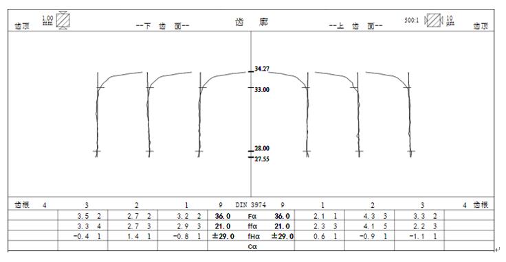 測量實(shí)驗采用軸(zhóu)向模數為4.0,法向壓力角為20°,導程角為11.2188°及砂輪半徑為240的ZC2型(xíng)蝸杆。在齒輪測量中心上對其進行軸截麵齒廓的測量,測量結果報告(gào)單(dān)如下。