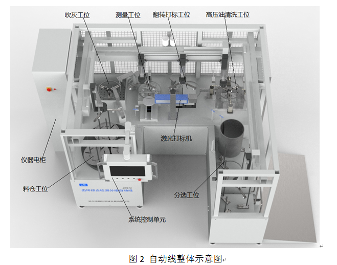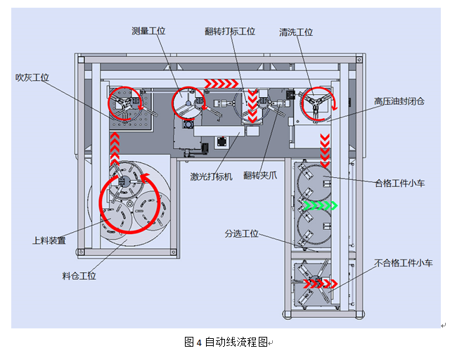 如(rú)圖4所示,自動線由料倉(cāng)工位,吹灰工位,測量工位,翻轉打標工位,高壓油清洗工位,分選工位等(děng)組成。
