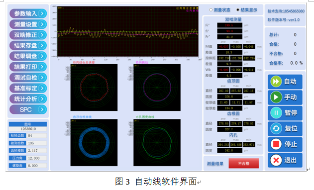 本文(wén)所述用(yòng)於薄壁圓環類齒圈檢測自動檢測線,設計為(wéi)多工(gōng)位串行工作的方式,能夠實現快速裝夾工件,測量,打標,噴油清洗,分選等功能。該設備集合了計算機多點控(kòng)製,多軸聯動,齒輪雙齧測量,激光測(cè)量,傳感器判斷,電動,氣動,液壓等多項先進的技(jì)術,實現了(le)被測工件自動上下料,零件相關誤差項檢測,方向判斷,翻轉打標,高壓清洗,分選(xuǎn)等功能。工(gōng)件從上料到分選出合格不合(hé)格整個過程僅需20秒,檢(jiǎn)測時間是人工檢測時(shí)間的1/5,是三坐標檢測(cè)時間的1/10,而且三坐標與人工隻能測(cè)量一些外形誤差,無法測量齒輪的精度誤差,而此台自動線都可以滿足測量要求。圖2為自動線整體結構示意(yì)圖。針對該檢測線自主開發相應配(pèi)套(tào)軟件詳情見圖3。