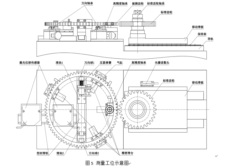 圖5的左(zuǒ)邊(biān)是工件的(de)定位裝夾裝置,在底部的4個(gè)精密滑(huá)台上有(yǒu)3個滑台安裝著高精度(dù)的萬(wàn)向軸承(3個萬向軸承的高度必須一致),根據被測工件的直徑大小調整每個精密滑台的位置,用3個萬向(xiàng)軸承(chéng)支撐著工件表麵使工件保持水平,並且能夠靈活的旋轉;在另一個滑台上裝有高精度軸承,將滑台調整到相應位置鎖緊,當機械手把工(gōng)件放到測量位置時,標輪向前移動與工(gōng)件齧合後,繼續向前直到高精度軸承將工件擋住,開始齧合測量。由於此類薄壁環形齒圈在熱處理時外形尺寸(cùn)變形比較嚴重,所以測量時會出現擺動現象,因此在中間安裝了(le)一個型材滑軌和兩個滑塊。滑塊1上安裝了一個彈性機構(gòu),放工件前氣缸通氣將(jiāng)萬向球1向後頂開,工(gōng)件就(jiù)位後氣缸鬆開萬向球1通過彈簧的作用緊緊地頂在工件內壁上,滑塊2上的萬向球2則提前調整到固(gù)定位(wèi)置鎖緊,通過萬向(xiàng)球1和2的相互作(zuò)用(yòng)將工件(jiàn)撐(chēng)起(qǐ),固(gù)定在中心位置,確保了齧合測量結果的穩定性。在另(lìng)一個型材滑軌上安裝著兩個激光位移傳感器。一個安裝在工件內部,一個(gè)在工件外部分別測量齒圈的內孔(kǒng)直徑與齒頂(dǐng)圓(yuán),齒根圓直徑等誤差項。