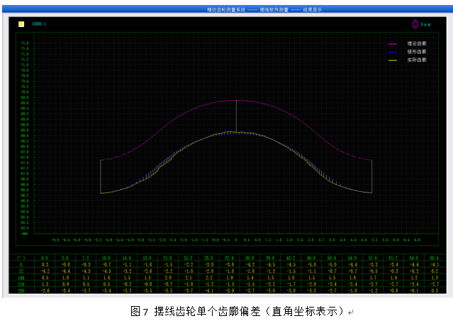 以上第一種齒廓表達形式,在誤差曲線長度(dù)方(fāng)向是擺線的等距齧合(hé)角度,反應的是擺線齒輪的齧合(hé)特性,而後一(yī)種齒廓(kuò)表達形式,是轉(zhuǎn)化成直角坐標(biāo),清晰表達理論齒廓,設計齒廓及測量實際誤差曲線的關係,更(gèng)緊密結合CAD數字化設(shè)計製造的評(píng)判(pàn)。