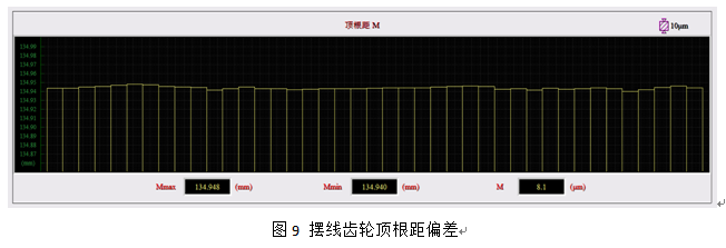 頂根距偏差和徑向跳動誤差由已經測量出擺線齒輪整(zhěng)周的數據,通(tōng)過數(shù)據處理,可(kě)以得到全部頂根距誤差變動曲(qǔ)線和徑向跳動誤差變動曲線,測(cè)量偏(piān)差結果如圖9、10所示。