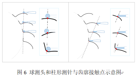 如圖6所示(shì),雖(suī)然(rán)由(yóu)於齒(chǐ)輪模數(shù)小,雙圓弧齒廓與標準漸開線(xiàn)齒廓相差不大,但由於球測頭接觸點變化,測得的曲線(xiàn)與真實曲(qǔ)線仍存在誤差,而點測頭不存在這(zhè)樣問題。