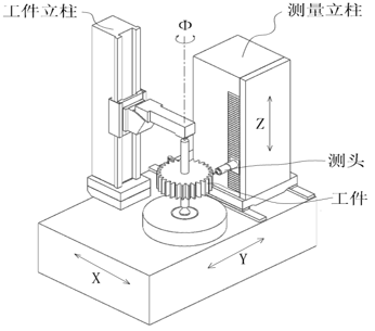 傳統的輪測量中心包括機械係(xì)統、數(shù)控係統和測(cè)量係統三部分。機械係統作為(wéi)齒輪測量中心的主體,主要包括四(sì)個坐標軸:切向軸X、徑向軸Y和垂直軸(zhóu)三個方(fāng)向的(de)直線軸,以及旋轉主軸Φ。四個坐標軸都安裝有光柵傳感器,在運動控製指令下完成測量任務。測量(liàng)係統隻有切向X方向(xiàng)的電感傳感器,可以根據齒輪的(de)漸(jiàn)開線原理,以Φ軸、X軸兩(liǎng)軸聯動(dòng)的形式(shì)完成齒輪誤差的測量。