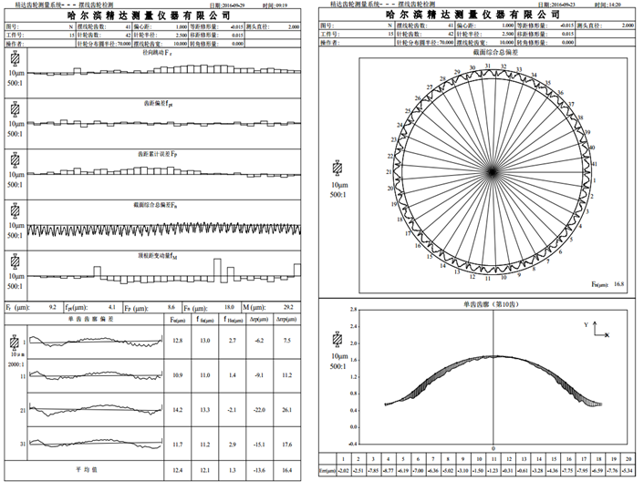 擺線齒輪作為RV減速器的關鍵部件,是目前行業最熱門的齒輪研究對象,由於擺線齒輪傳動過程需要進(jìn)行修形設計製造,以利於傳動,同時,為提高擺線(xiàn)齒輪副傳動精度,減少機構“背(bèi)隙”,RV機(jī)構中的擺線齒輪要求很高的製造精度。同理,在齒輪測量中心上,鎖定(dìng)三(sān)維測頭的切向及垂直方向(xiàng),主軸轉(zhuǎn)動,儀器徑向通過三維測頭(tóu)的徑向測微功能,實現儀(yí)器徑向對主軸(zhóu)的測頭跟(gēn)蹤控製,采用極坐標測量(liàng)方式,對齒輪誤差(chà)進行全(quán)量數據采集及誤(wù)差處理,完成擺線齒廓的測量,測量結果如下: